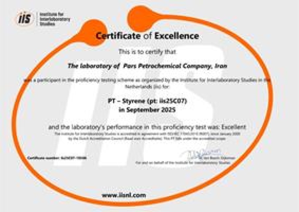 بر اساس گواهی صادره از سوی مؤسسه مطالعات بین‌آزمایشگاهی (IIS)، آزمایشگاه پتروشیمی پارس در آزمون مهارت PT – Styrene که در سپتامبر ۲۰۲۵ با مشارکت ۳۶ آزمایشگاه از ۱۸ کشور جهان برگزار شد، توانست عملکردی «عالی» از خود به ثبت برساند.